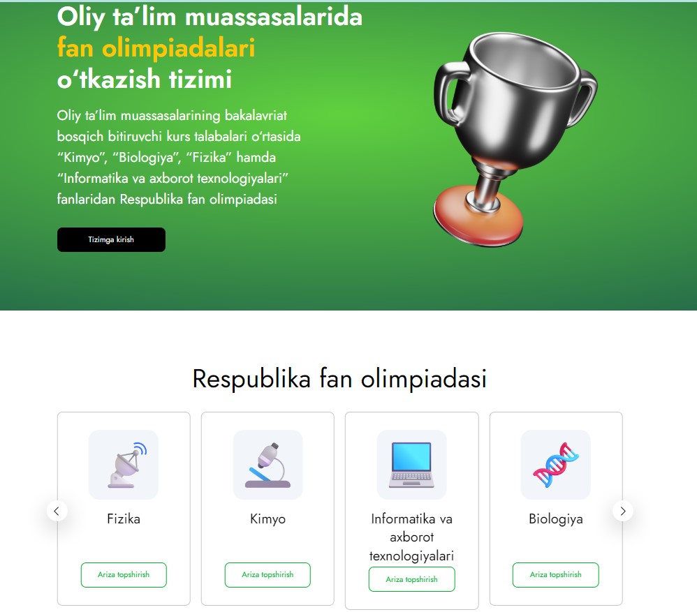 Ishtirok etmoqchi bo'lgan talabgorlar ushbu havola orqali ro'yxatdan o'tishlari so'raladi: www.olimpiada.edu.uz